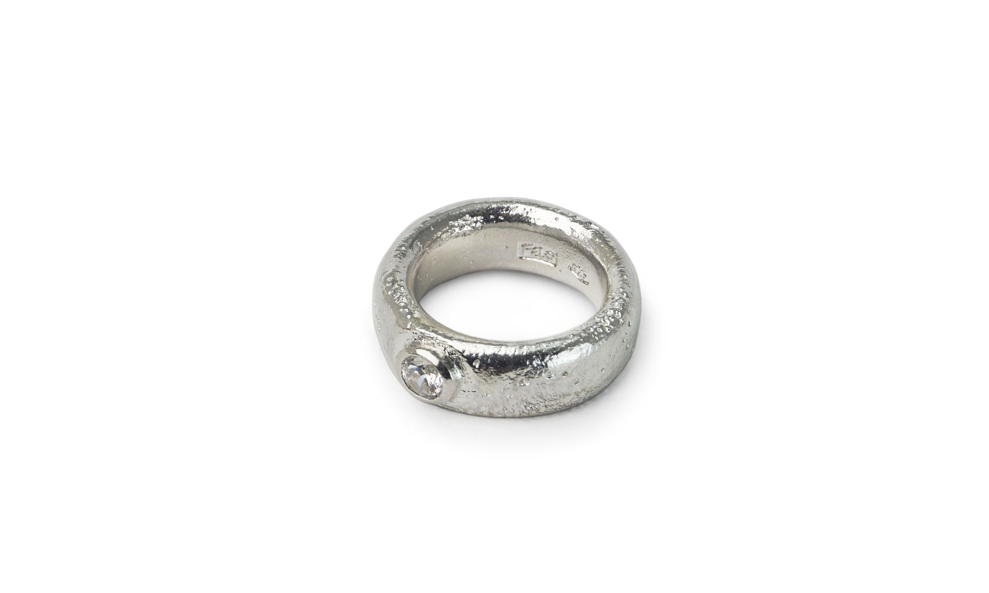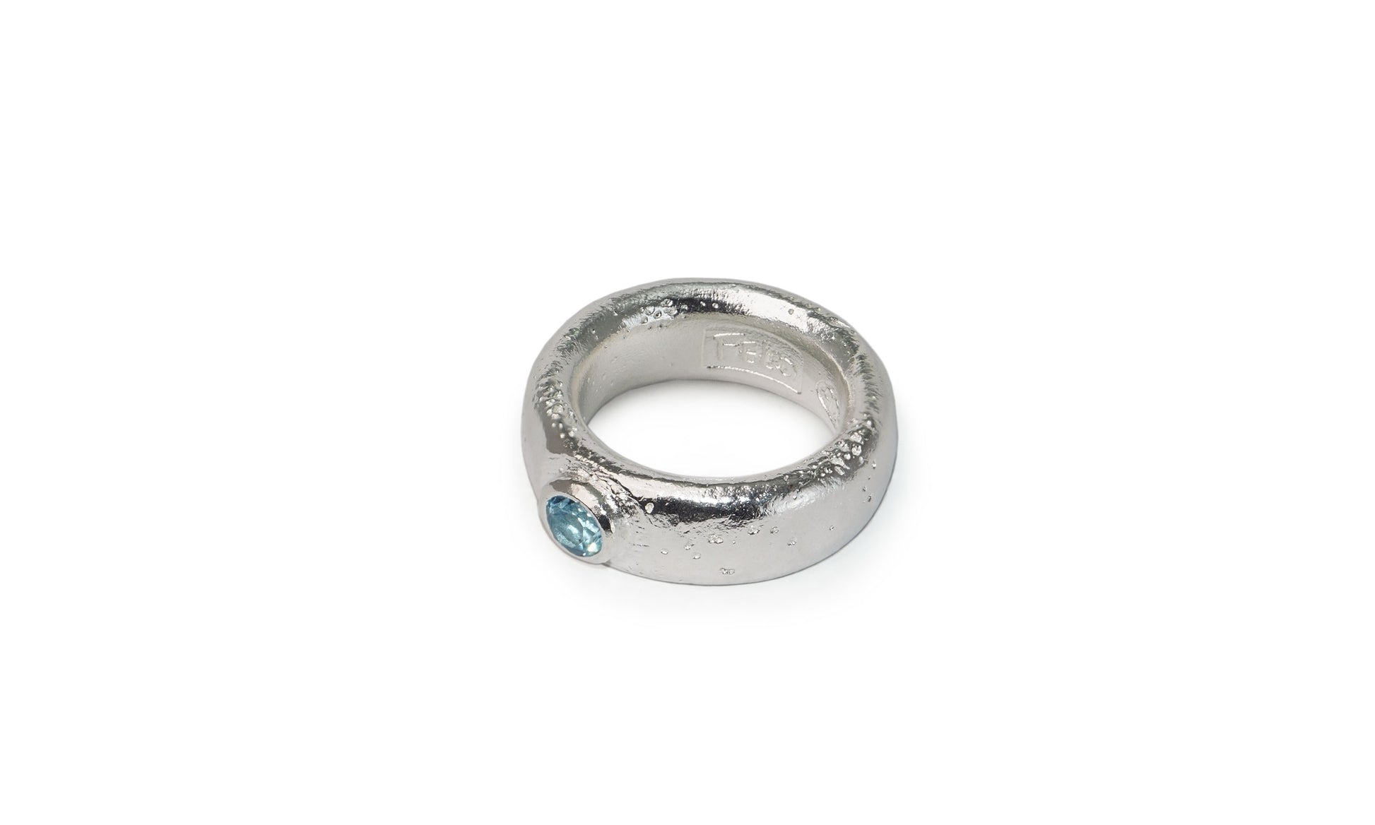 A chunky, hand-cut sterling silver band with a molten, organic form. The surface carries natural pits and textures, highlighting the imperfections of handmade silver. Set with a single 3mm round faceted gemstone on its front face. Finished with our own tumbling process for its unique FELO look. Stamped with a 925 hallmark and logo.