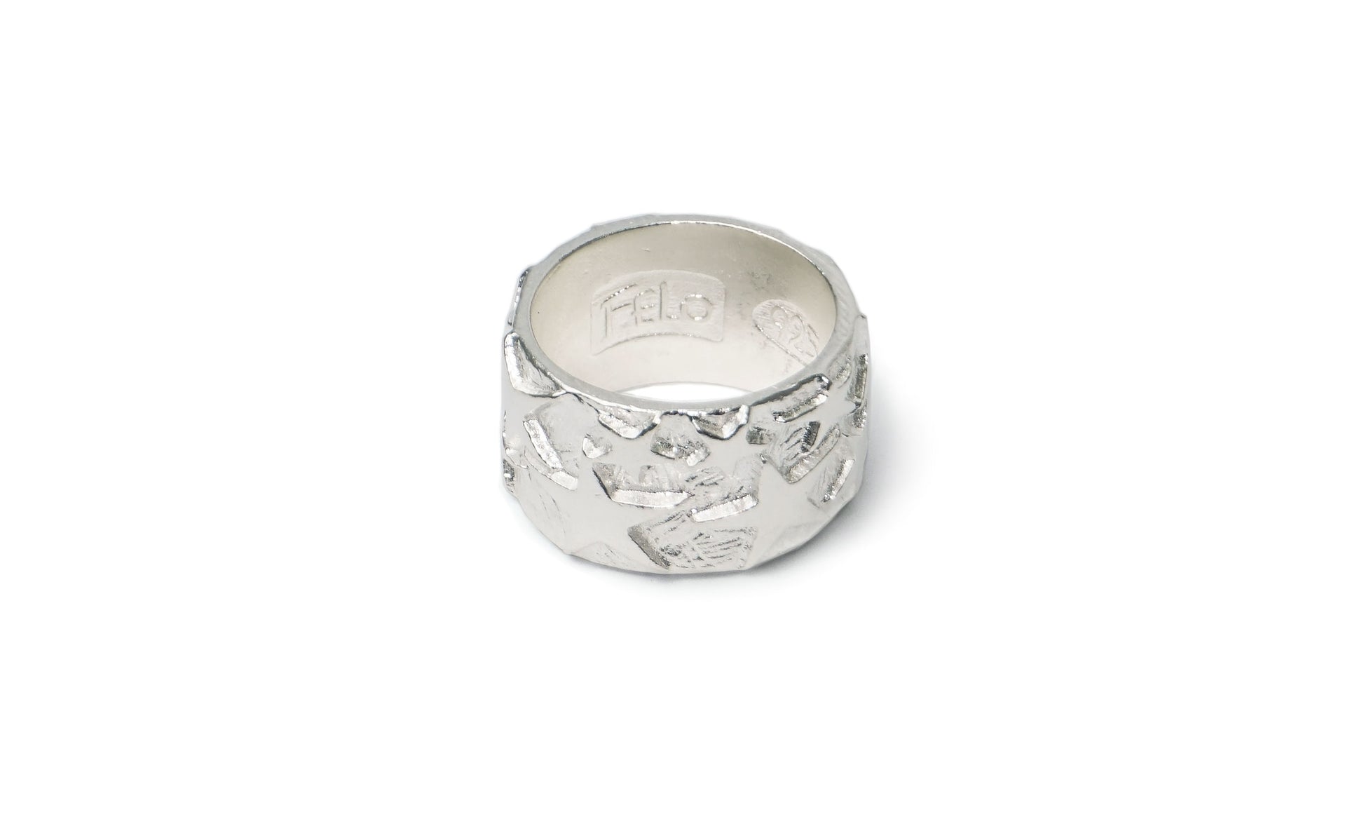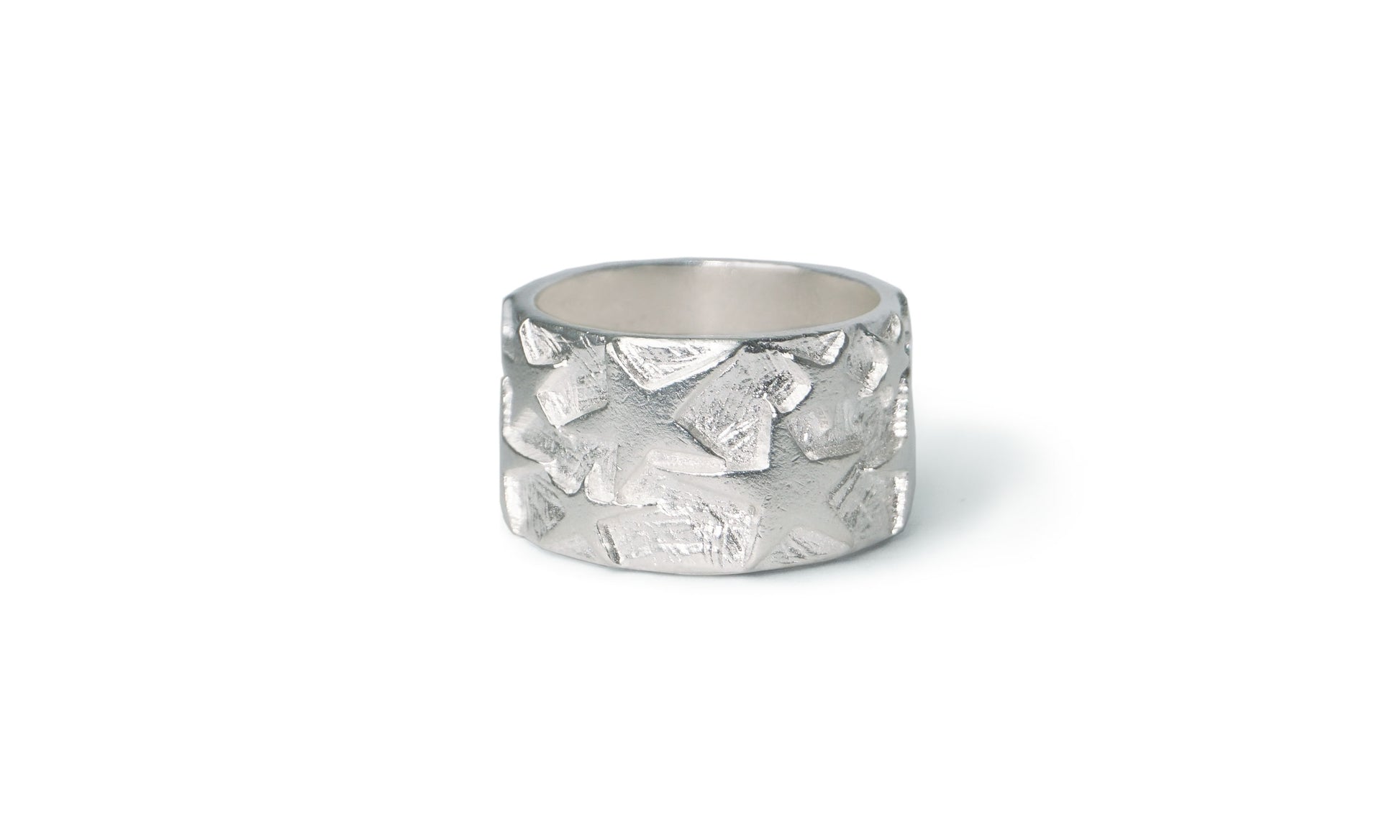 Rough cut silver wide band, hand cut Stars scattered externally. Inner 925 Hallmark and logo.