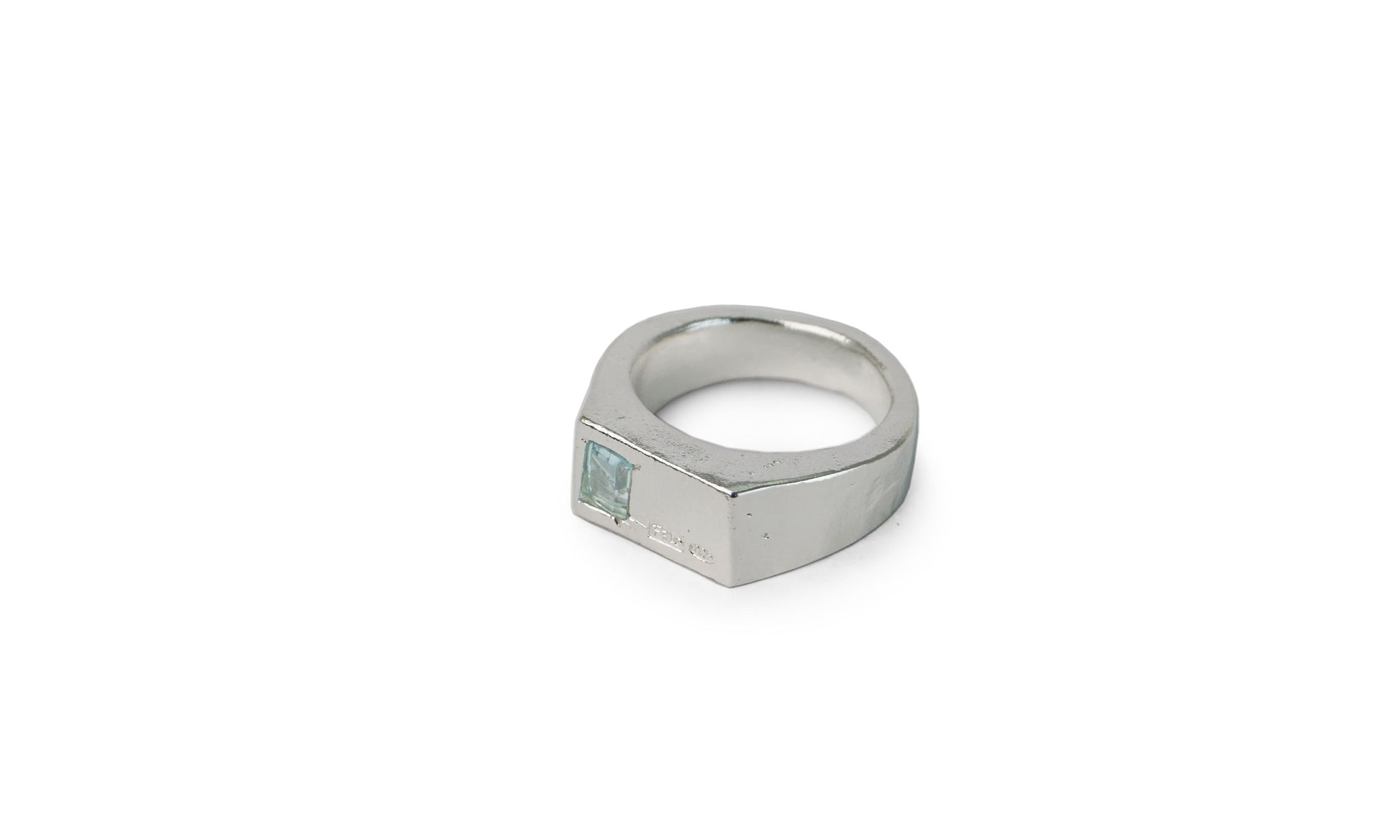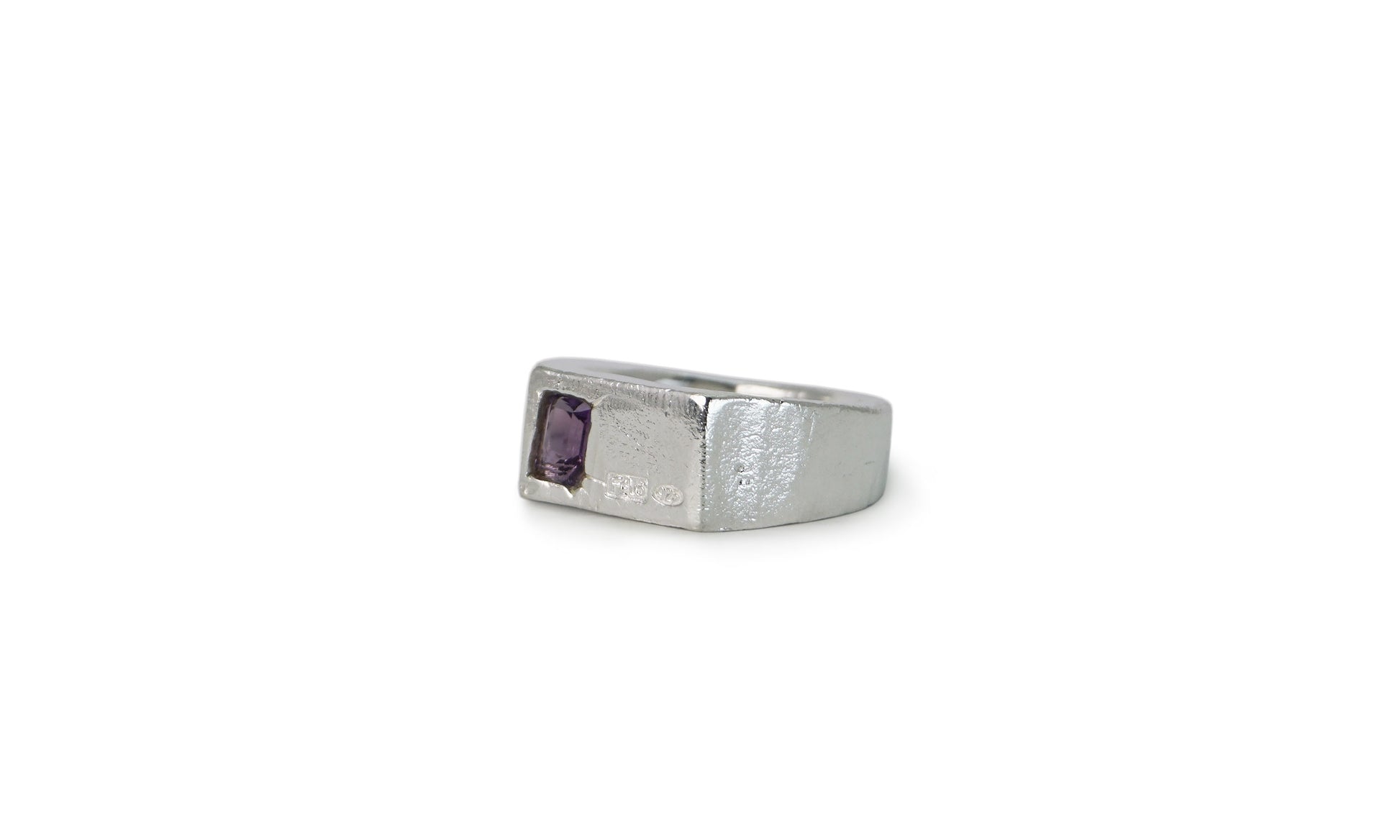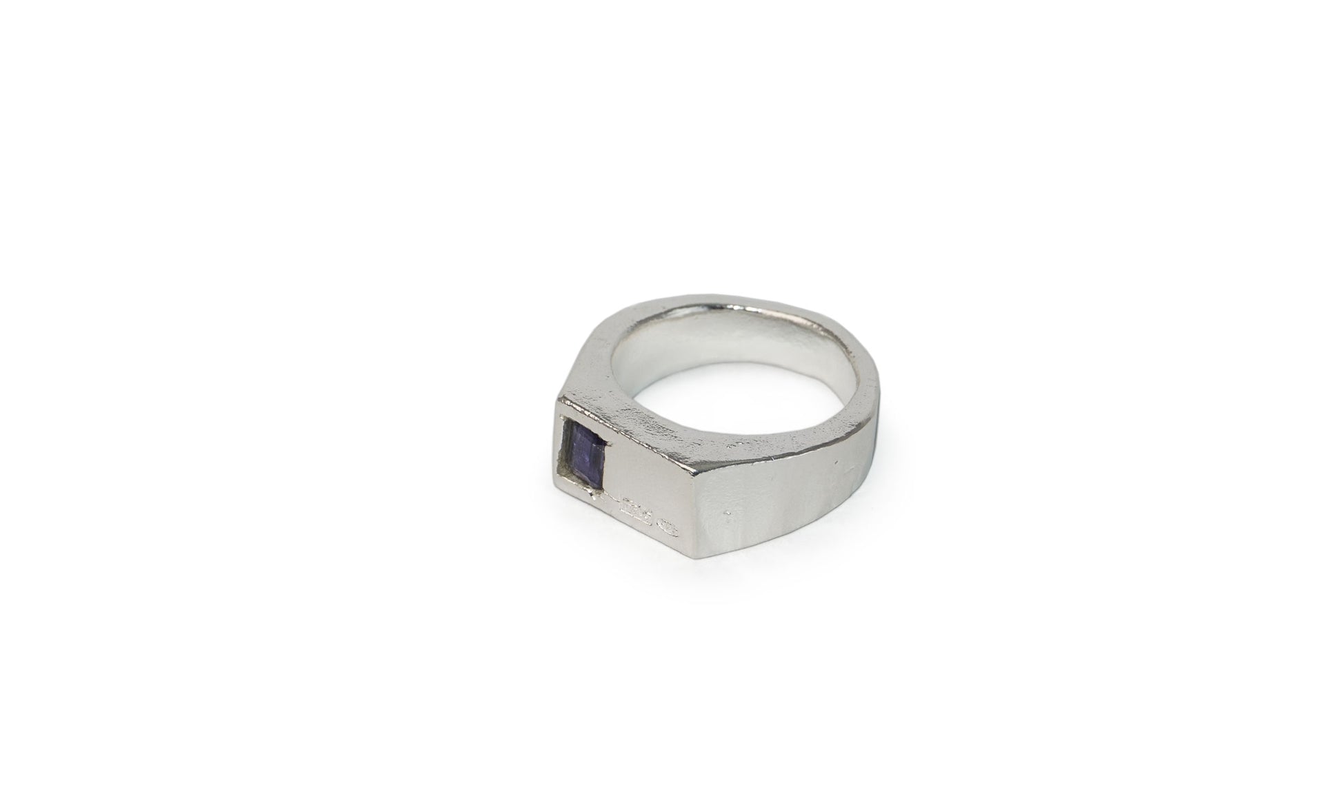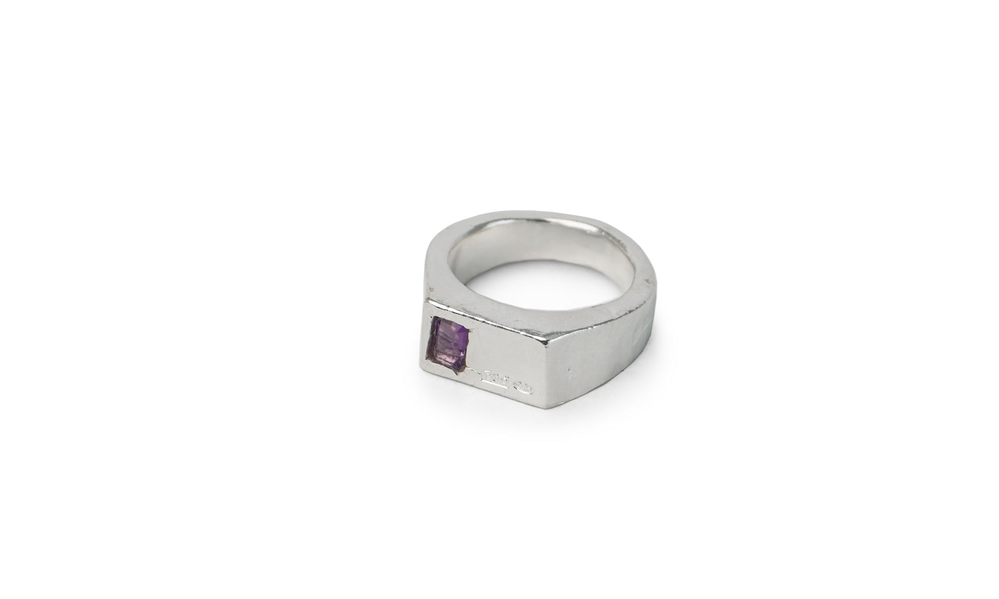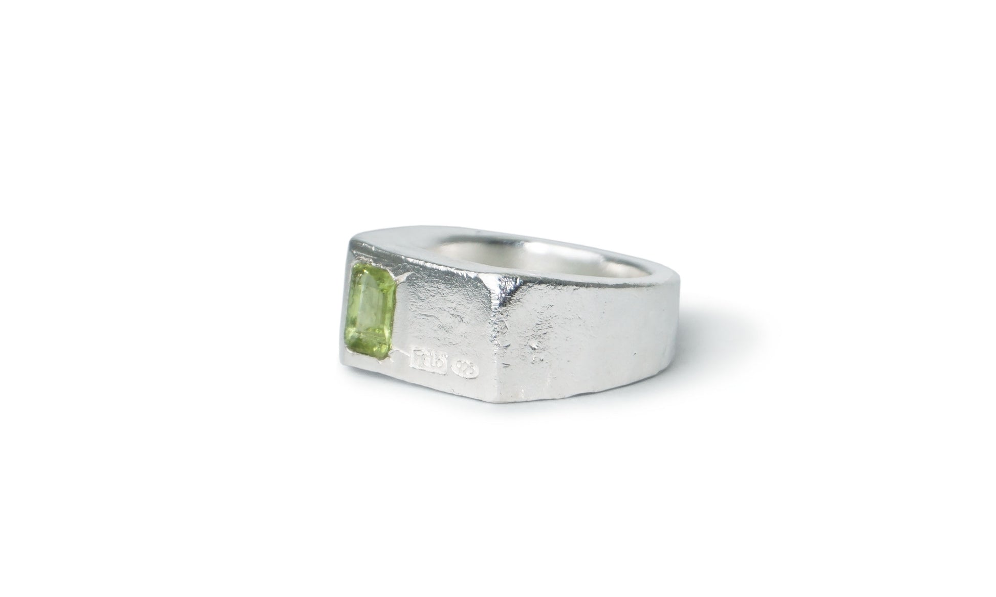 A chunky, raw-cast silver ring featuring an Emerald-cut Peridot, Iolite, Rhodolite Garnet, Sky Blue Topaz, Pink Quartz or Amethyst set into its bold, geometric band. The unpolished texture and angular form highlight its rugged, handcrafted aesthetic.